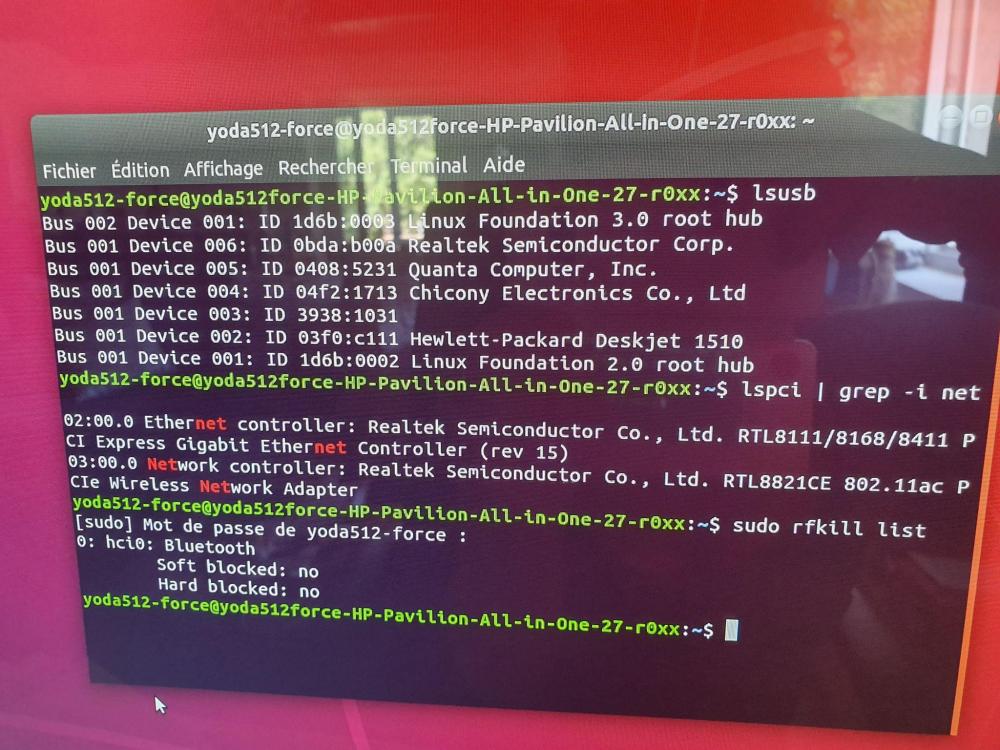 6. Bonjour , Je débute sur linux j'ai installée ubuntu 18.04.2 sur mon pc en plus de windows 10, mais ma carte wifi n'apparait pas! j'ai taper des commandes pour identifier ma carte réseau nom + chipset (photos ci-joint) wlan0 = 1 j'ai vérifier que ma carte réseau ne soit pas bloqué 2 j'ai activer la couche logiciel sous windows 3 j'ai fait une mise à jour logiciel sudo apt-get update + sudo apt-get install build-essential (installation build-essential ne marche pas ) Il me manque peut être un micro-programmes mais si oui le quel installer et comment? je suis vraiment débutante alors merci pour votre aide . j'ai réussi à connecter mon téléphone pour avoir un accès à internet en bluetO marine