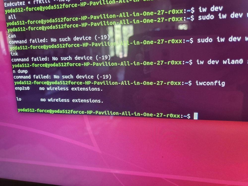 5. coucou merci pour ta réponse rapide je vais réinstaller ubuntu pour être sur qu'il n'y a pas d'erreur et je tape ta commande mais mon wlan0 est introuvable il ne le détecte pas je re ;)