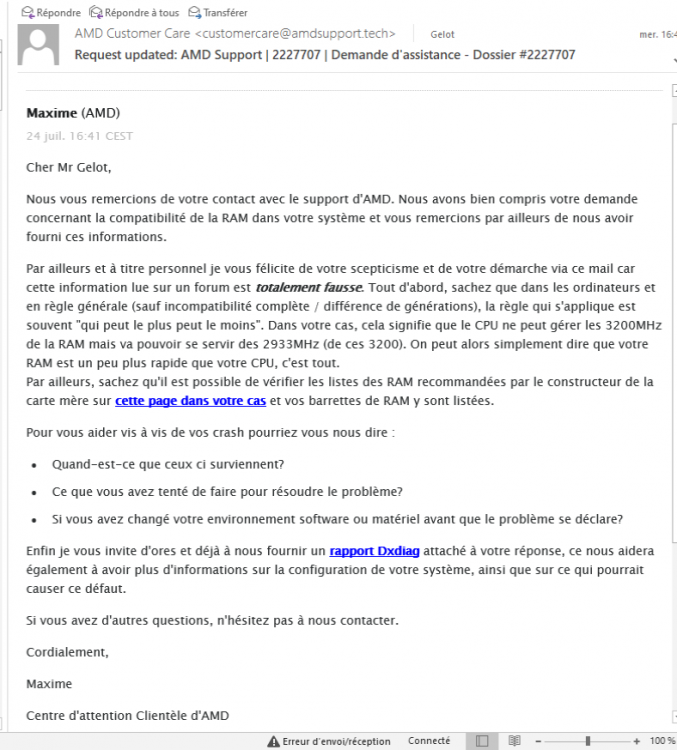 10. Bonjour la Communauté du CrabeInfo, Je viens vers vous, suite au conseil de christinep0631 de la communauté de Microsoft, pour des soucis de crash de Windows 10 sans fichier dump(pour mieux comprendre le sujet : https://answers.microsoft.com/fr-fr/windows/forum/windows_10-performance/crash-windows-10-sans-fichier-dump/3339774d-5a5d-4f8a-9927-f67e18f727ec?tm=1563366965822&page=5&rtAction=1563797023597&auth=1 ) Deux personnes(dont christinep0631) pensent à une incompatibilité de mes barrettes de mémoire avec ma config, et moi je ne pense pas car je les ai achetées suite à mes recherches effectués sur Internet, afin d'avoir des pièces compatibles et éviter "normalement" les problèmes que je vis actuellement.... Ma config : CM : MSI X470 Gaming Pro Carbon Processeur : AMD Ryzen 5 2600 RAM : 16Go HyperX Predator 3200MHz (HX432C16PB3AK2/16 en 2x8go) SSD 250 Go Samsung Evo CG : RTX 2060 MSI Gaming Z 6G Qu'en pensez-vous?? Merci d'avance !
