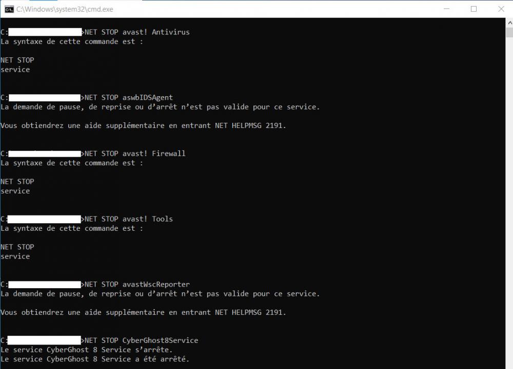 J'osais pas trop mettre ça ici: Faire comme dans la copie écran jointe et ensuite, faire un stop ou pause comme tu le conseilles au départ: NET PAUSE "avast! Antivirus" NET PAUSE aswbIDSAgent NET PAUSE "avast! Firewall" NET PAUSE "avast! Tools" NET PAUSE avastWscReporter NET PAUSE CyberGhost8Service NET PAUSE "Nom du service wifi" Netsh interface set interface name ="nom de la connexion wifi" admin=DISABLED Faire pareil avec ces commandes: sc.exe control "avast! antivirus" 255 sc.exe control "avast! Firewall" 255 et mettre un "pause " à la fin pour observer le résultat. Il faut décocher la case qui empêche les services d'être désactivés: