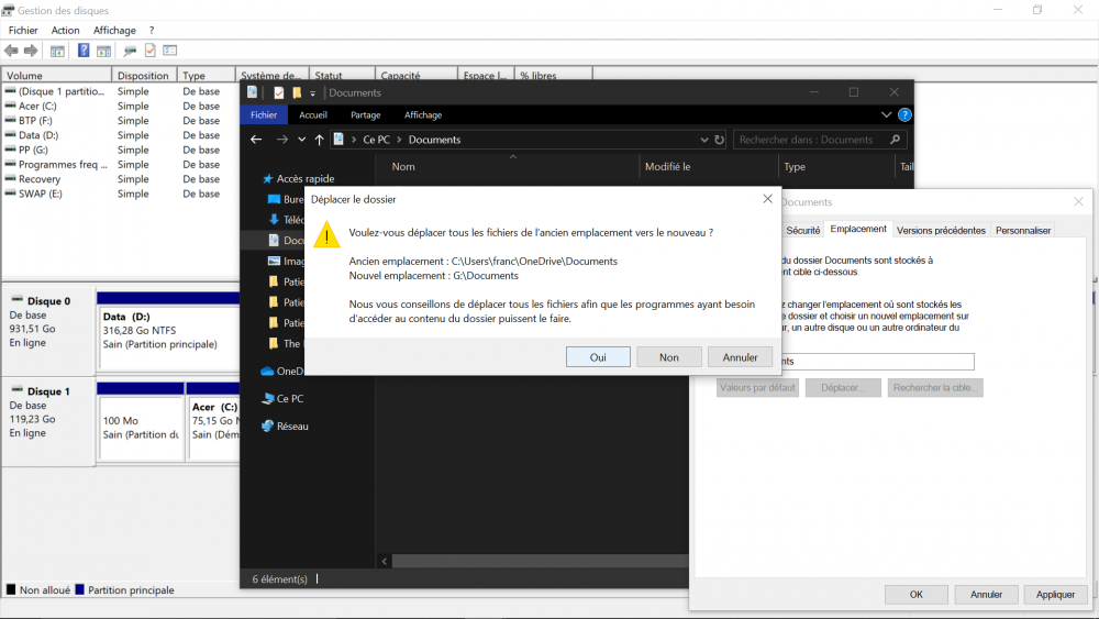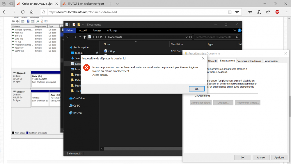 Ensuite je commence à partitionner le disque dur : Et Le Problème arrive ensuite quand je cherche à modifier l'emplacements des fichiers Images, Documents, vidéos et Musiques. Je décide de déplacer l'emplacement de Musiques vers la partition D: J'ai donc un créé un dossier Musiques dans D: , ça marche bien! Ensuite documents vers :G , ça ne marche pas