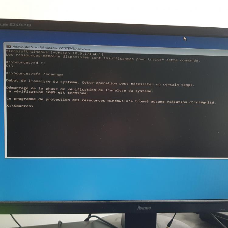 Voici le résultat, Je ne sais pas pourquoi je suis dans X:\Sources, c'est peut être normal en bootant depuis une clé (j'ai essayé de faire un cd c: mais ça n'a rien changé). Au début il me parle quand même de ressources mémoire insuffisantes, peut être que j'ai mal fait le sfc /scannow.