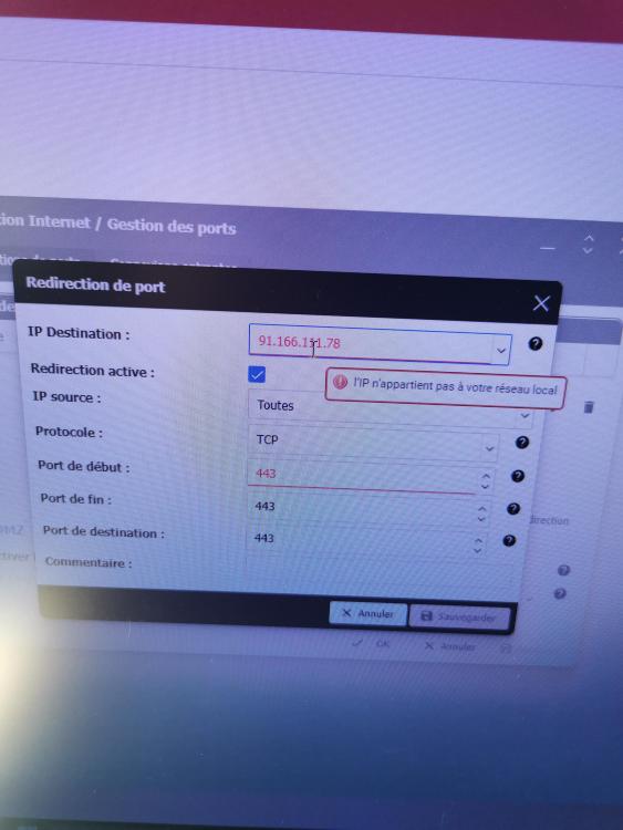 alors ca ne marche pas , voici le soucis avec LES captures capture 1 j'ai mis mon adresse IP de l'ordi mais vu le message ca ne doit pas être ca j'ai donc mis ladresse ip du hub du coup et la l'écriture est en noir dc est ce bon pr l'adresse ? et ensuite capture 2 quand je rentre le port 443 il me dit que je dois choisir un port sup a 37778...je fais quoi du coup ? je comprend rien ... -