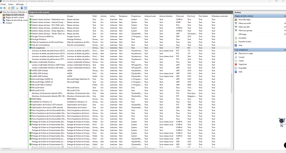 Bonjour à tous, voila mon soucis: je dois brancher un petit appareil connecté a ma box via un câble ethernet mais il n'est malheureusement pas détecté .. bref après avoi écrit un message au SAV de ce produit il me demande de vérifier ceci : Il est important de vérifier qu'il n'y pas de firewall et que les ports ports HTTPS – 443 et/ou MQTTS – 8883 sont ouverts. j'ai essayer de faire des recherche par moi même sur le net en essayant d'ouvrir le port 443 ( je ne me suis pas penchée sur le port 8883 je n'y comprend déjà rien au premier port... ) et malgré des essaies je n'arrive pas à ouvrir ce fichu port , je dois donc faire mal quelque chose quelqu'un peut il m'expliquer depuis le début comment ouvrir le port et vérifier qu'il est bien ouvert ? est ce que mon pare feu le bloque ? mais je vais pas désactiver mon pare- feu non plus non , c'est bien trop risqué ? merci de votre aide, je suis perdue PS : pour ouvrir le port, j'ai suivi les conseil de ce site entre autre , je suis allée dans pare feu windows , paramètre avancé ect et suivie la procédure mais ca marche pas ..... voici une capture d'ecran de ce que jai fait : c'est hub surepetcare -