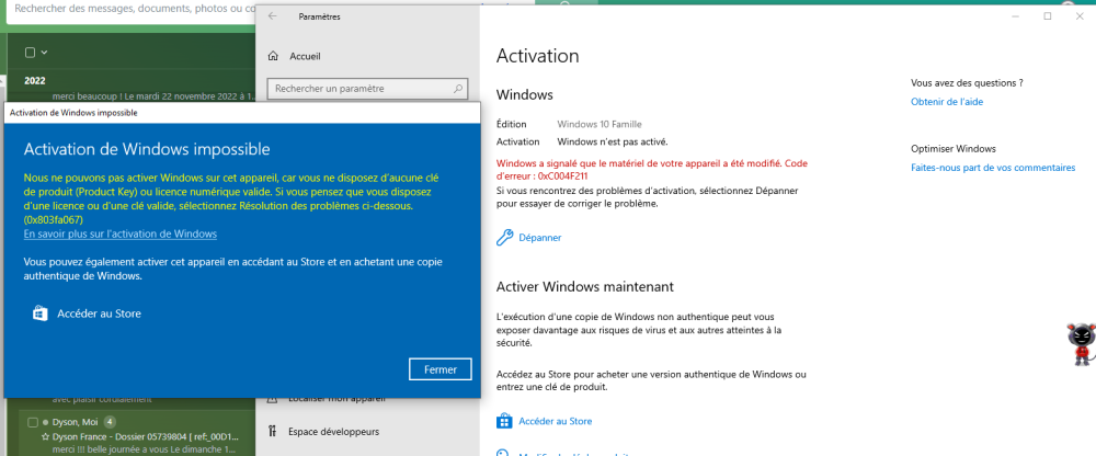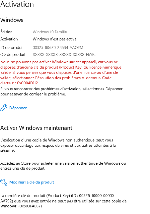 hello @calisto06 je suis prête pour passer a window 11 là dans windows update j'ai plein de MAJ a telecharger DE WINDOWS 10 et j'avais une License Windows 10 Famille, faut il que je le rentre afin d'activer déjà windows ? hum voici ce que j'ai quand j'ai voulu rentrer ma License, ( c'était celle que j'avais en 2022 quand j'ai pris windows 10 famille )