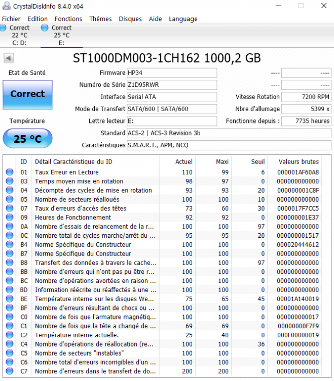 Bonjour à tous, Je viens de découvrir un logiciel CristalDiskInfo Standard Edition. Rien de révolutionnaire pour les pros que vous êtes...mais je voulais le partager avec vous à tout hasard si vous ne le connaissez pas. Il permet de mesurer l'état de santé de son SSD etHDD, de connaître le nombre d'heure d'utilisation rapidement. Pour le reste, j'ai besoin de l'avis des Experts du forum. Voici les photos...quel est votre avis pour le SSD et/ou HDD...C'est grave Doctor ! Pour le SSD : Pour le HDD : Merci pour vos réactions et vos contributions qui me permettront de comprendre un peu cette science obscure qu'est l'informatique voire de m'alerter le cas échéant. Mousse qui vous dit à bientôt...