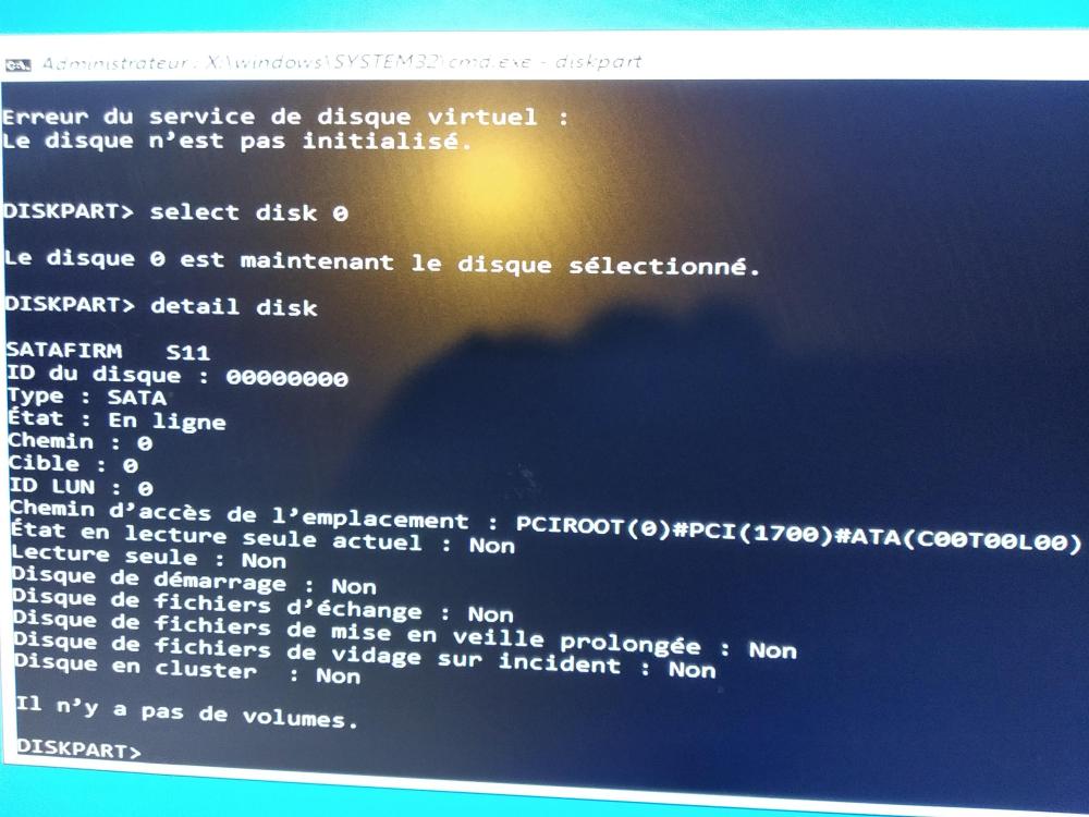 Je suis allée sur différents forum et j'ai vérifié le bios, le DD est là et en premier au démarrage (PJ :photo) ensuite j'ai fais une clé de démarrage et ça me mettais réparation impossible. Ensuite j'ai fais un diskpart et là ça note "disk 0 pas de partition ou pas initialisé" et là je ne sais plus que faire!