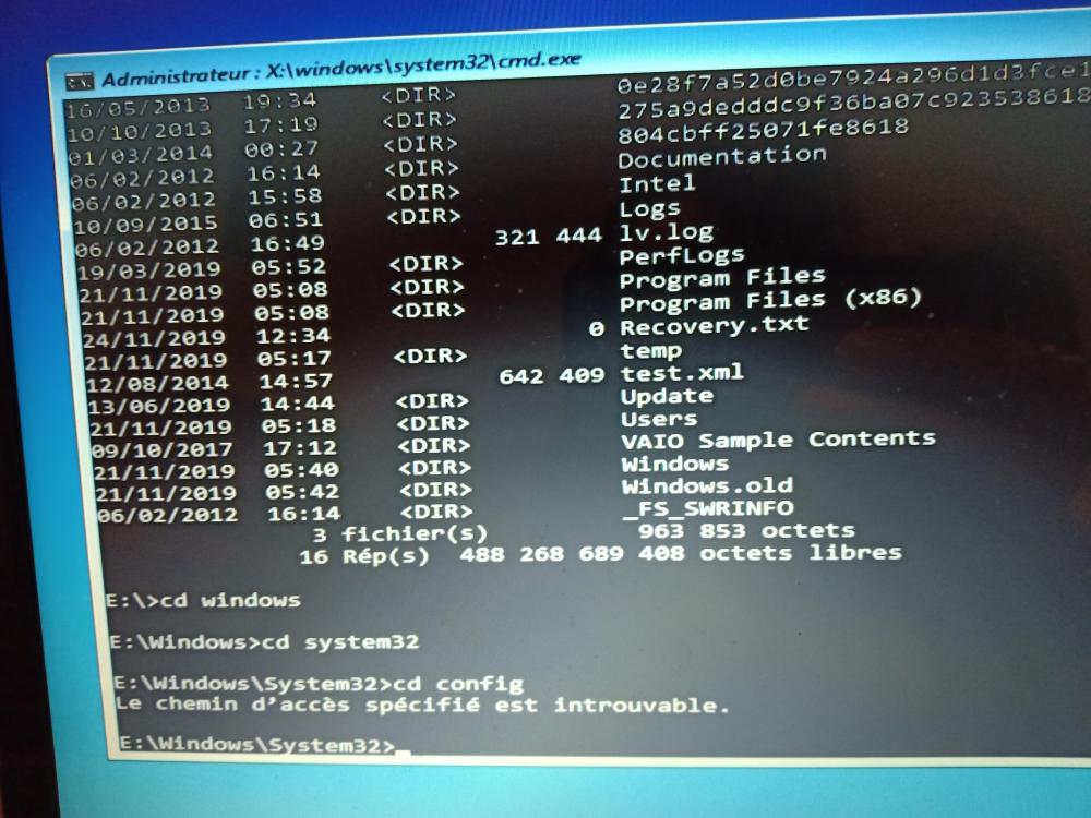 9. Bonjour à tous, Alors : suite à une grosse MAJ sur pc portable pas branché (la batterie a lâché au beau milieu. ...) ÉCRAN BLEU depuis ; outils de démarrage système/marche pas désinstaller MAJ/marche pas réinitialiser/marche pas et pas de point de restauration (trop facile !) la j'étais sur un tuto qui semblait pouvoir m'aider mais ... En gros passer par l'invite de commande et bricoler le dossier Regback mais en arrivant à "cd config" = le chemin d'accès est introuvable POURQUOI ?? Je précise le pc n'est pas le mien si je peux éviter de formater ça m'arrange ...