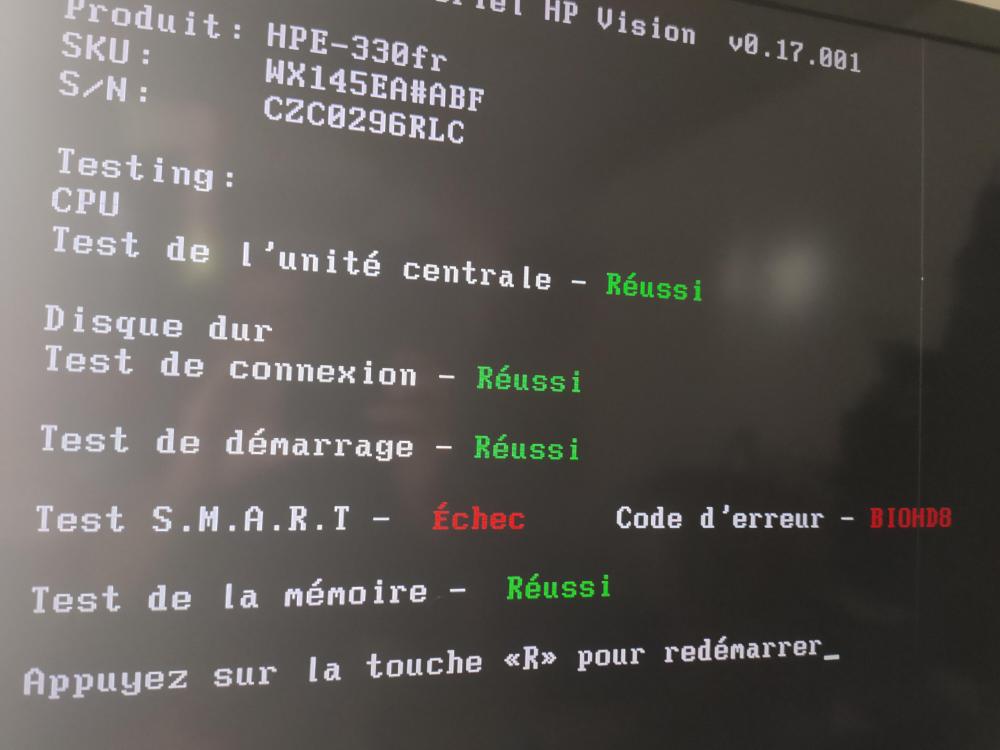 6. bonjour à vous, sur HP pavillon HPE, tentative de mettre un SSD (neuf, w10 déjà installé) et ... voilà : "Code erreur BIOHD-8" HELP !!!