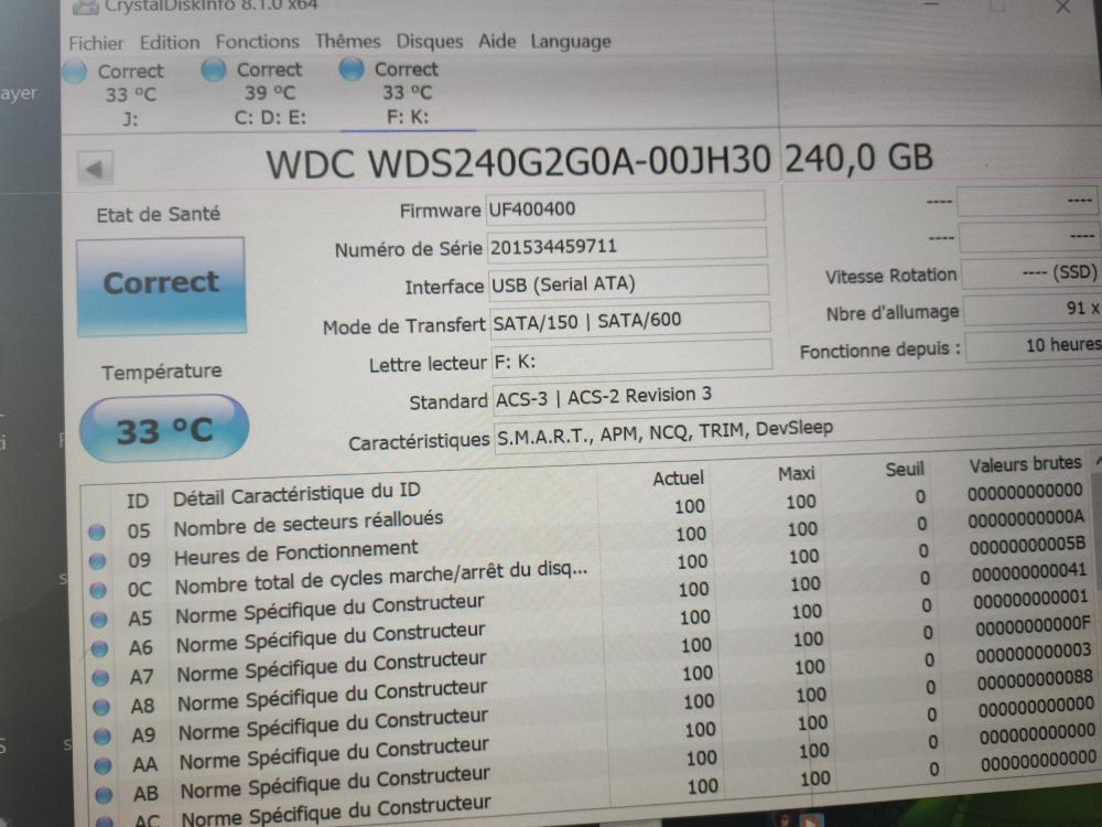 j'ai fait le diagnostic rapide SMART sur le "Western Digital Dashboard" : RAS ... j'ai lancé l'étendu mais ça m'étonnerai, le SSD est neuf ! au point ou j'en suis j'ai formaté et voulu réinstaller w10 mais même la clé ne boot pas y compris avec un vieux hdd là je sèche ...