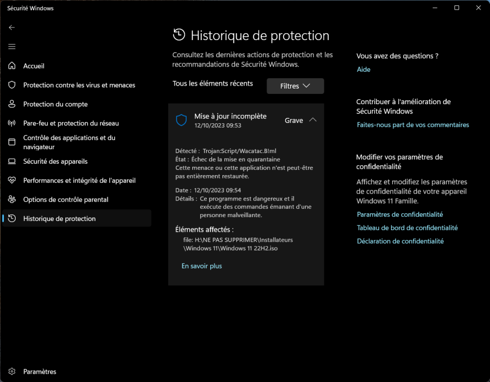 Bonjour, au cours d'une réinstallation de Windows 11 grâce à l'ISO que j'avais téléchargé sur le site de Microsoft lors du passage à Windows 11 22H2 il y a un an. Windows defender ma alerté à propos de: Détecté : Trojan:Script/Wacatac.B!ml État : Échec de la mise en quarantaine Cette menace ou cette application n'est peut-être pas entièrement restaurée. Éléments affectés : file: H:\NE PAS SUPPRIMER\lnstallateurs \Windows 11\Windows 11 22H2.iso (pour info H:\ est la lettre du lecteur de DVD virtuel créé pour monter l'ISO). Ce que j'ai fait: Suppression de l' ISO. Téléchargement de l' ISO "Win11_22H2_French_x64v2" sur le site de Microsoft, vérification du SHA256 à partir de la même image disponible sur le crabe (je l'ai téléchargé sur le site de Microsoft car la durée de téléchargement était excessive). Réinstallation de Windows à partir du nouvel ISO. Scan de Windows defender complet et hors ligne: pas d'alerte. Je joint des captures d'écran. Merci pour votre aide.