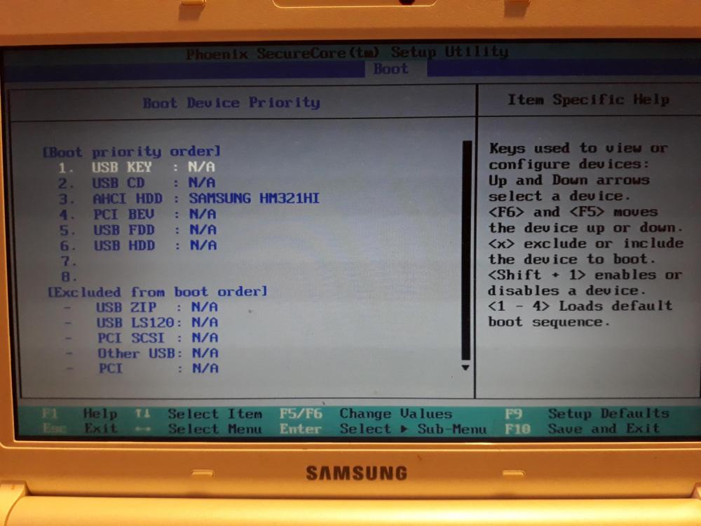 Bonjour, J'ai un PC SAMSUNG N145 Plus qui tourne sous W7. Je souhaite le mettre sous Linux/MINT. J'ai fait une clé bootable. Lorsque je rentre dans le boot (F2), je vois que je ne peux pas forcer l'ordre du boot car devant USB, il y a "N/A" que je traduit par "Non Applicable". Quelqu'un a une astuce ?