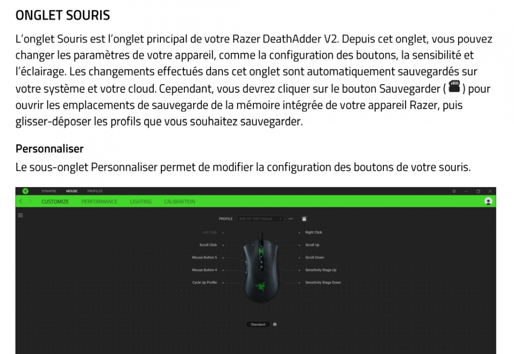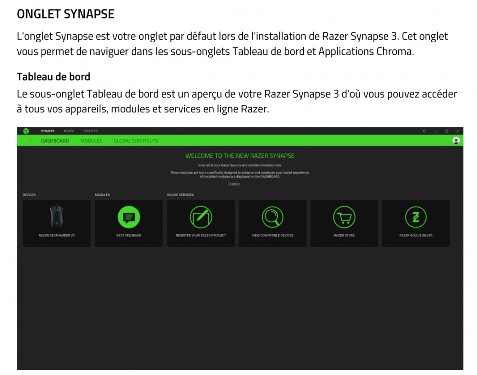 16. Bonjour toutes et tous J'ai acheté une souris Razer DeathAdder V2. J'ai désinstallé les pilotes et la souris que j'avais avant. Et j'ai installé la nouvelle. Comme vous le verrez sur la capture ci dessous il y a une interface qui s'installe automatiquement (logiciel Synapse 3) avec tout ce que vous possédez comme matériel et applications de la marque. Sauf que chez moi le module souris ne s'installe pas. Après plusieurs mail d'assistance avec mon vendeur (LDLC) très pro, la personne m'a dit de retourner la souris et qu'il m'en envoyait une autre. J'ai reçu ce matin la nouvelle, re installation et même problème, je n'ai pas l'onglet souris. Et forcément je ne peux donc pas paramétrer les boutons de la souris. Je suis sous W10 dernière version qui fonctionne parfaitement. J'ai exécuté la commande DISM puis sfc /scannow pas de soucis, windows defender pas de soucis, Eset en ligne pas de soucis...... Jamais d'écran bleu donc ?????? Auriez vous du matériel de chez eux et est ce que l'installation s'est bien passée pour vous ? Je me suis enregistré chez RAZER et j'ai essayé de voir s'il y avait une assistance : au téléphone pour les USA seulement et pour la France je n'ai trouvé qu'un Chat" robot qui ne comprends pas mes questions. GRRRRRR Si vous avez une idée, j'achète Merci d'avance et bonne journéesoirée