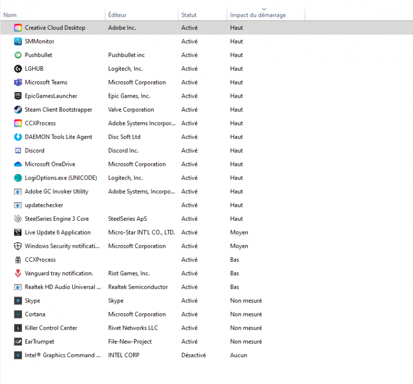 Bonjour @calisto06 ! En pièce jointe, les programmes qui démarrent en même temps que Windows. Par ailleurs petite précision, le jeu Valorant auquel je joue possède un AntiCheat du nom de Vanguard et il semble bloquer un truc au démarrage (pièce jointe numéro 2). je vais regarder pour le mode minimal !