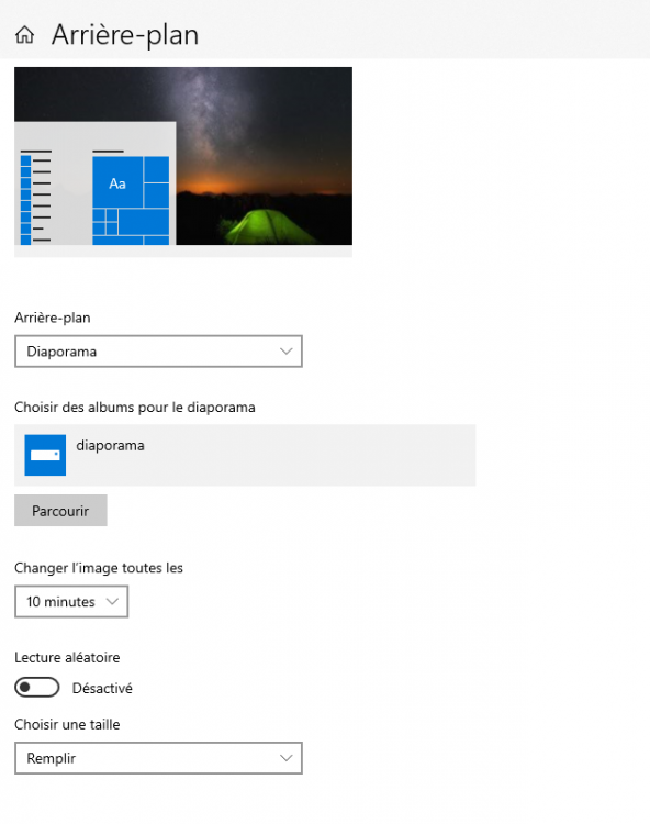 24. Bonjour je voulais créer un diaporama pour mon fond d’écran, windows 10.J'ai donc recuperé des fonds d'écran que j'ai placé dans un dossier. Puis je suis allé dans personnalisation de mon écran, j'ai ouvert diaporama, puis j'ai choisi le fichier que j'avais préparé, mais quand je l'ai ouvert ,rien ne s'est affiché, comme si il était vide. Je ne comprends pas pourquoi. Merci de vos réponses.