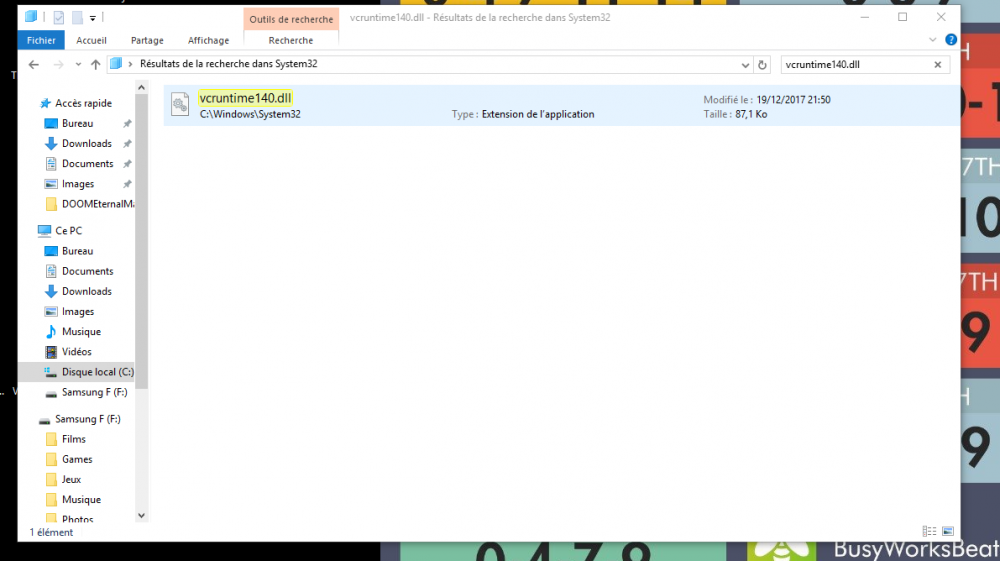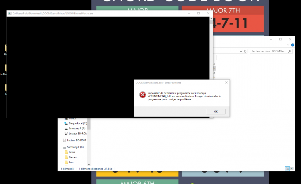 7. Bonjour , Je me permets de vous solliciter cher amis en ce lundi de confinement. J'ai télécharger une macro spécifique pour un jeu, c'est un exécutable que je souhaiterais ouvrir qui n'as pas de rapport direct avec le jeu ( je précise qu'il n'est pas nécessaire d'intégrer ce fichier au répertoire du jeu afin de le faire fonctionné ) J'essaie de lancer mon exécutable en vain ... J'ai le message suivant qui s'affiche " Impossible de démarrer le programme car il manque VCRUNTIME140_1.dll sur votre ordinateur. Essayez de réinstaller le programme pour corriger ce problème " (Screen 1) J'ai donc effectué des recherches concernant ce fameux .dll.et sur la plupart des sites que je trouve on me dit donc de réinstaller Visual C ++ Redistributable. (Screen 2) J'ai donc essayé de réparé tout les composants Visual C ++ après redémarrage toujours le même problème ... J'ai désinstallé le pack 2017 puis réinstaller un pack 2015 - 2019 trouvé sur le site de Microsoft toujours pas résolu ... ( Screen 3) Ce que je ne comprends pas non plus c'est qu'après une recherche dans " C:\\Windows\System32 " j'ai bien le fichier vcruntime140.dll ! (Screen 4) Quelle solution envisager ? Merci d'avance FT.