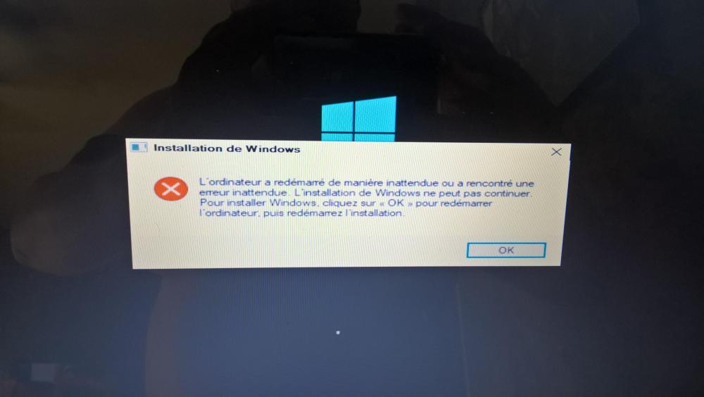 3. Bonjour Calisto06, Voilà j'ai bien suivi les directives pour installer Windows10 à partir du tuto donc l'installation se passe bien cela va même très vite par rapport à avant bien sûr avec un disque dur neuf, au moment où le programme d'installation demande à redémarrer l'ordinateur, une première fois c'est reparti au démarrage de l'installation donc cela n'allait pas donc j'ai recommencé après avoir bien relu le guide d'installation et où ils disent de faire attention à ce que le programme ne redémarre pas sur la clé USB donc j'ai tout recommencé en débranchant la clé au redémarrage et donc le programme fait une préparation des périphériques de 1 à 100% et ensuite il se fige sur préparation et plus rien ne se passe pas d'écran bleu pour paramétrer Windows10, que dois-je faire ? Après quelques minutes à attendre cette fameuse préparation voici le message passé à l'écran ( voir photo!)