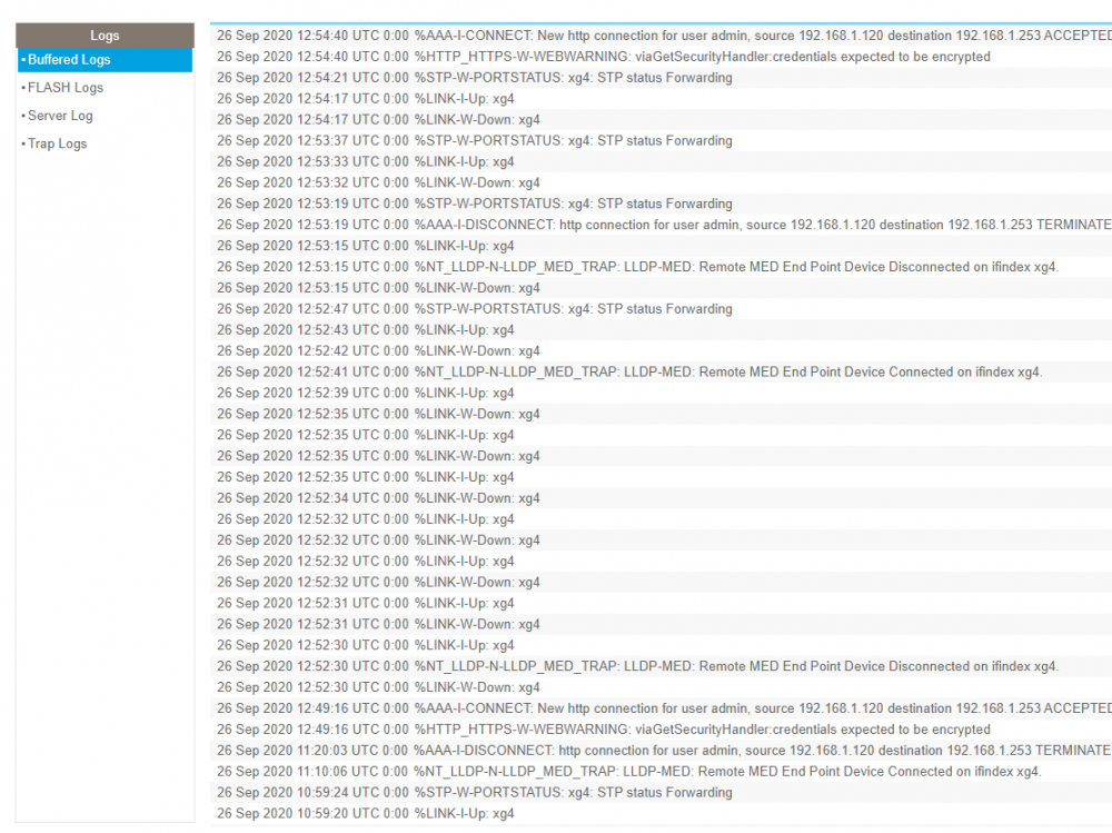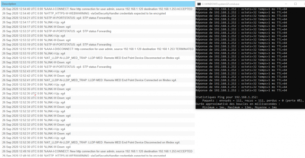 On retrouve des up/down, mais moins fréquents. Un screen que je viens de prendre, le port 19 servait hier (petit calcul pour déterminer l'heure exacte) à quelqu'un qui pilotait le pc en team viewer toute la journée, et sans doute le soir. Il n'y a pas eu de perte de connexion pour lui de ce que j'en sais. J'ai fais un ping sur le switch Master3D (.252), ça passe donc par le switch video incriminé et le Lag, aucune perte de paquet ni up/down. En updatant les logs 5 minutes après l'arrêt du ping, je vois que le port a de nouveau sauté... le ping était 12h49, l'alternance à commencé 3 mins plus tard, j'ai uploadé à 54 (j'avais perdu l'accès web entre temps.. Mais je crois qu'il y a un time out, sauf erreur de ma part) Donc je recommence un ping -t en attendant un peu plus, et en updatant les logs constamment : rien ! Sur les logs du switch master, rien n'est apparu ! -