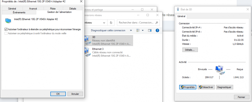 Deplug/replug du RJ sur le pc pour retrouver l'accès au réseau. J'ai vu passer ça : Effectivement la vitesse a l'air bloquée sur 1Gb (je cherche la soluce pour y remédier). Je vois aussi à gauche, la mise en veille de la carte si elle n'est pas utilisée. Penses-tu que cela puisse participer au problème, et s'il ne vaut pas mieux décocher l'option ? Je n'ai accès qu'à ce PC, mais je pense que la config doit être la même sur les autres. -