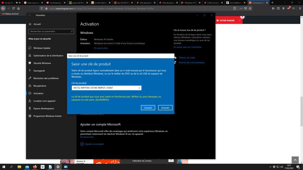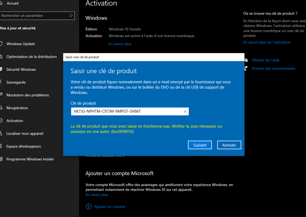Salut à vous ! Je cherche à passer de win10 famille vers pro sur un PC fixe récemment acheté (d'occas). J'ai trouvé sur conseil, une clef "d'occas" pour ne pas payer les 300eu d'ugrade via le microsoft store. J'ai aussi compris qu'il n'était pas possible de passer d'une telle version vers pro, sans passer par le store, à moins de réinstaller l'OS de zéro, ou d'utiliser une clef générique. J'ai choisi cette dernière option, et trouvé la clef "VK7JG-NPHTM-C97JM-9MPGT-3V66T" qui est la même quelque soit les sources sur le net (valable pour win10 pro donc). En passant par les menus de config de win, j'ai tenté d'upgrader l'OS vers cette version grâce à cette clef, dans l'objectif de rentrer ma clef achetée par la suite. Pourtant, il m'est dit en premier lieu que la mise à jour n'est pas possible. Après quelques recherches, je retente via le microsoft store directement, avec la même clef générique : on me dit que la clef n'est pas valide. Tant pis pour la clef générique je me dis, j'ai pas grand chose d'installé sur ce PC, et je peux éventuellement tout réinstaller via une image. Le truc c'est que maintenant, et suite à ces manip, on me dit que la version actuellement installée de win famille n'est pas activée. Ca me rebute un peu donc, et ayant besoin que ce PC soit fonctionnel ces jours ci, pourquoi cela ne planterait pas en réinstallant l'ensemble ? Du coup la question : j'ai bien une clef win10 pro achetée et à priori valide, quelle serait la methode pour l'activer malgré les problèmes rencontrés plz ? Merci d'avance !!