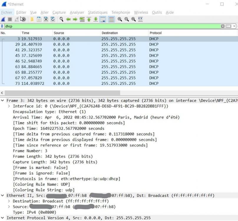 Bonjour ! Merci pour vos réponse, le déplacement du sujet et le masquage des infos Je n'avais pas pris le temps de mettre toutes les commandes et test effectués effectivement, je refais quelques test ce matin : J'ai ma carte en ip dynamique, et je branche la paire sur un port du routeur qui doit me fournir une ip en 10.11.12.0/22 (config vérifiée et opérationnelle avec un autre PC). C'est toujours un routeur MikroTik CCR. Le port clignote et le lien est détecté, avec un wireshark je remarque que mon PC envoi bien le dhcp discover en broadcast, mais aucune réponse n'est reçue, et la demande est bien renvoyée en boucle (img 1). J'ai effectivement utiliser les commande ipconfig /release et ipconfig /renew en boucle ces derniers jours sans succès .. J'obtiens au final une ip hapipa (img 2). Je tente un /release + /renew, et j'observe de nouveau les DHCP discover depuis wireshark et ma carte ethernet, sans réponse et en boucle. Je suis aller checker sur l'interface du mikrotik depuis ma carte wifi et une autre des ses ip, j'observe bizarrement que le serveur dhcp reçoit bien le discover, propose un bail, mais ne reçoit pas la réponse de mon pc ? Après quelques seconde, le lease proposé disparait des bails affichés (la MAC address est bien celle de ma carte..) (img3) J'ajoute que la table arp est toujours vide, et que je suis censé pouvoir me connecter au routeur via son adresse hapipa, sa MAC et un mactelnet, chose que j'ai d'ailleurs testé avec une Debian en dualboot, mais même un macping et un mactelnet ne fonctionnent pas...... (j'ai cassé la debian entre temps, du coup je n'peux pas fournir de screenshot ). D'ailleurs, le problème persistait bien avec la debian, donc je serais tenté d'écarter l'hypothèse d'un soucis côté windows, non ? Voilà voilà... J'ai tout de même aussi réinitialisé totalement les paramètres réseaux depuis windows, réinstallé le drivers Intel, ... J'ai aussi fouillé côté mikrotik, il y a bien quelques cas visiblement de soucis de connexion via winbox depuis une machine win10, je vais creuser un peu plus. Mais ce qui m'éberlue c'est que le soucis est apparu d'un coup, et même résolu à un moment en retentant sur un nouveau port du routeur entre deux reset. Quoi qu'il en soit, j'ai contourné le problème en me connectant via une AP, et mon collègue possédant un macbook n'a lui aucun soucis à communiquer avec la machine. Si vous avez des pistes, je suis preneur:) Merci et bonne journée à vous ! PS : pour résumer donc, les deux cartes sont bien sur le même LAN, le routeur reçoit bien un dhcp discovery provenant de mon adresse MAC, renvoit une offer vers cette même adresse mac, mais mon PC ne la réceptionne pas, et n'est pas non plus en mesure de macpinguer la MAC du routeur (visible depuis le hardware de la machine) ... -
