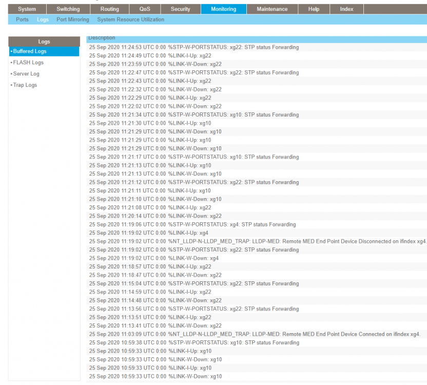 Bonjour ! C'est noté ! Plutôt en attente. Je suis allé voir les paramètres green ethernet, tout ce qui peut être désactivé est désactivé, ce qui est la config par défaut je crois. A noter que certains paramètres ne peuvent pas être désactivés, comme la mise en "veille" du port si pas de courant détecté, ou le une espèce de calcul de longueur de câble.. Ci joint les screen de la config green ethernet : Ci dessus pas moyen de désactiver les options activée Ca correspond je crois bien aux postes actifs actuellement sur ce switch. Autre chose, voici un exemple des logs de ce matin (date/heure ne sont pas à jour) lorsque je suis arrivé, certains ports font la fête alors que personne ne les utilise.. Le 22 n'est toujours pas utilisé, mais alterne entre up/down, et le stp le forward... -