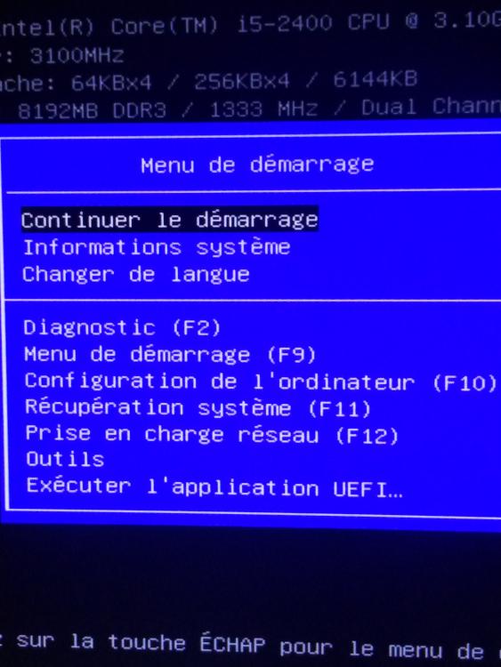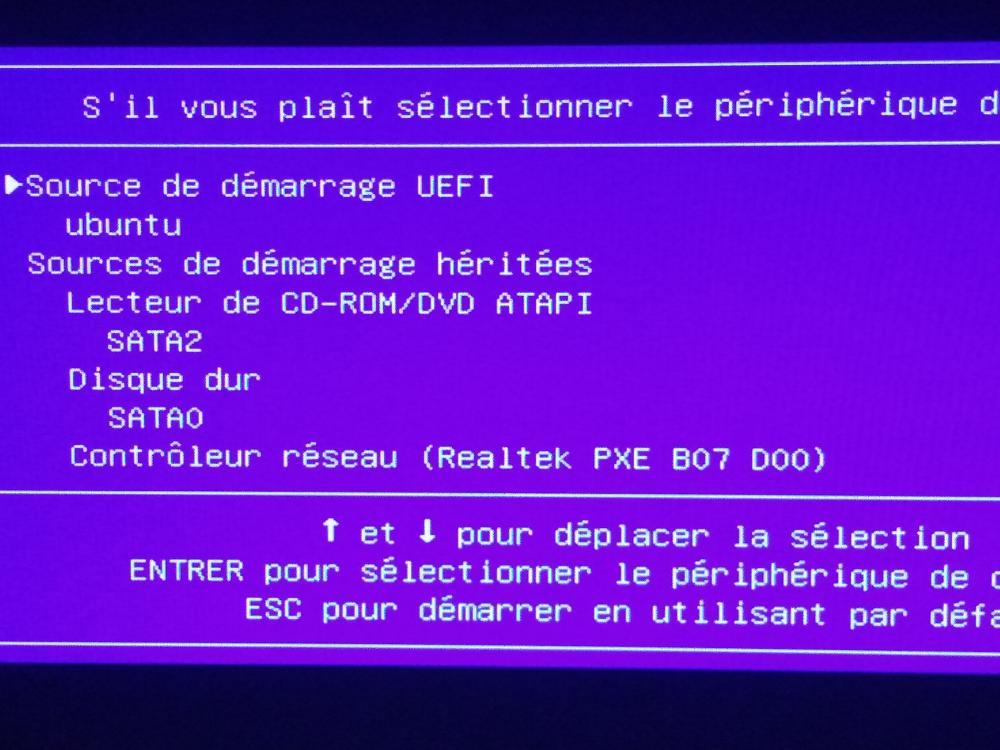 Comme je l'ai écris plus haut, mon Bios a changé. Voila ce que j'obtiens avec "Echap" au démarrage (photo 1) et après avoir choisi F9 et sélectionné SATA 0 (photo 2) j'avais grub avec l'option Ubuntu et les versions ainsi que Windows. Maintenant, même en choisissant SATA0, c'est Ubuntu direct. Je reste avec l'idée que le problème de place empêche l'accès, peut-être une "option" de grub.