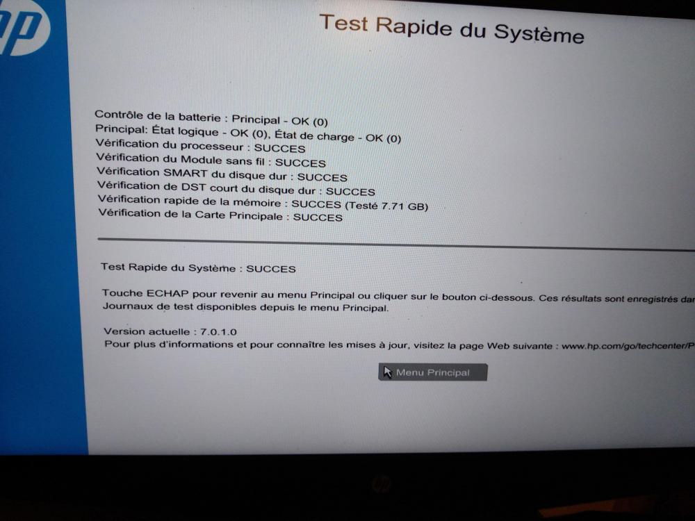 Bonjour à tous ! Je rencontre un problème assez embêtant depuis maintenant plus d'une semaine : mon ordinateur ne démarre plus. Je suis à court d'idées pour résoudre ce problème, je pose donc ce message dans l'espoir que quelqu'un ait par hasard une idée du problème que je rencontre. Avant tout, je vous récapitule le problème (et ses évolutions), ainsi que ce que je j'ai fait pour essayer de le résoudre. Je possède et utilise comme ordinateur principal depuis presque 3 ans un ordinateur portable HP Pavilion Gaming 17-cd0011nf. Vous pouvez consulter les caractéristiques détaillées de cet ordinateur ici. Je l'utilise en dual-boot avec Manjaro Linux (sur le disque SSD), et Windows 10 (sur le HDD - que je n'utilise que très occasionnellement pour jouer). Tout allait bien jusqu'il y a un peu plus d'une semaine… Premiers problèmes… Subitement, mon ordinateur refuse de démarrer. Rien de particulier n'a été fait récemment, pas de mise à jour quelconque. Plus concrètement, voici ce qu'il se passe quand je le démarre : Le démarrage s'amorce comme d'habitude, mais au bout d'une seconde, un bip court retentit et le démarrage s'arrête, comme brusquement coupé. Le voyant d'alimentation est allumé, mais rien d'autre. Après 2-3 secondes, l'ordinateur relance le démarrage, là encore coupé par un bip court. Quelques secondes plus tard, les ventilateurs et le disque dur se mettent à tourner. Mais rien ne se passe, l'ordinateur reste dans cet état. Voici une vidéo du démarrage (le son n'est pas très bon, désolé) : https://drive.infomaniak.com/app/share/259773/633adcff-a17a-4ddc-9b8c-19dae972ad48 Je me renseigne un peu auprès de gens ayant des connaissances plus poussées que moi en la manière, ainsi qu'avec le chatbot du site de HP, qui me suggère un problème de corruption de la mémoire de démarrage et m'indique de retirer la batterie. N'ayant pas le matériel pour ouvrir l'ordinateur, j'en commande sur internet. Le lendemain, je réessaie d'allumer mon ordinateur et miracle, il démarre tout à fait normalement. Un diagnostic rapide du hardware (avec l'outil constructeur dans le BIOS) ne révèle aucune anomalie. Cependant, le surlendemain, le problème se reproduit et impossible d'allumer l'ordinateur. Tentative de réparation Hier, je reçois enfin le kit de réparation que j'ai commandé et ouvre l'ordinateur. J'effectue quelques vérifications sur les composants auxquels j'ai accès pour m'assurer que tout est correctement branché (disque HDD et SSD, RAM, batterie). Je retire la batterie et branche l'ordinateur sur le secteur. Une fois l'ordinateur redémarré, un message m'indiquant que la mémoire CMOS a été réinitialisée s'affiche (voir photo, désolé pour la qualité, on lit : The CMOS checksum is invalid. The CMOS will be reset to the default configuration and will be rebooted.). L'ordinateur démarre ensuite directement sous Windows, alors qu'il affiche normalement le menu GRUB. Je pense d'abord que l'ordre de boot a été restauré, mais visiblement rien n'a été changé en allant dans le BIOS. Jamais deux sans trois. Tout content que mon ordinateur soit réparé, je le démarre de nouveau aujourd'hui. Mais là rebelote, le même problème se reproduit encore. Enfin pas tout à fait, puisque cette fois un message m'indiquant qu'aucun système d'exploitation n'est installé s'affiche. Le message me propose d'exécuter un diagnostic, qui là encore ne trouve aucune défaillance. J'essaie de démarrer sur une clé USB où j'ai des images de distributions Linux pour afficher les partitions et vérifier que rien n'est corrompu, mais impossible de boot sur la clé. De plus, les changements d'ordres du boot ne semblent pas pris en compte dans le BIOS… Je n'ai plus vraiment d'idée pour résoudre ce problème, et cela m'embêterait beaucoup de devoir changer d'ordinateur alors que mon actuel est plutôt récent et entièrement fonctionnel (jusqu'à récemment). Merci d'avance à toute personne susceptible de m'aider ou de me donner une piste pour sortir de cette situation ! PS: N'hésitez pas à me demander plus de précisions si besoin :)