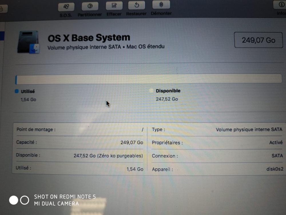 1. bonjour, suite à une erreur, après avoir cliqué par erreur sur restaurer, j'ai tenté de réinstaller MacOs High Sierra sur mon vieux mac mais je n'ai pas pu car lorsque je clique sur le disque où l'installer, il me dit que le disque est verrouillé. La photo de mon Os X Base System donne une capacité du disque de 249?07 Go de 1,54Go utilisé et donc 247,52 Go disponibles Que représente le 1,54 Go utilisé Je ne sais pas s'il y a une image de l'Os, mais je n'ai pas de CD et suis obligé de passer par wifi Merci à ceux qui s'intéresseront à ma question.