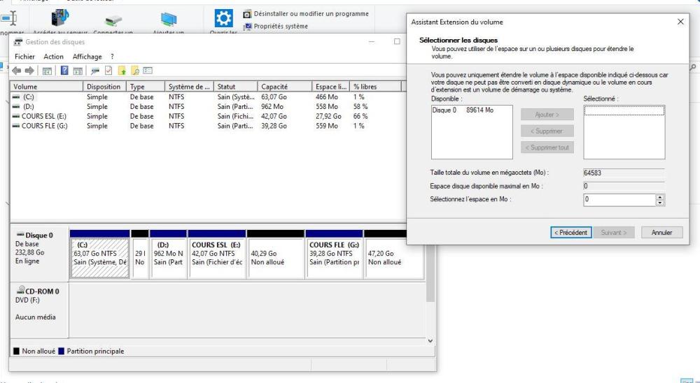 Bonjour, Je vous écris car je suis bloqué : j'ai suivi le tuto "de base" pour étendre mon volume c: mais quand je clique sur étendre il n'affiche les partition non allouées. J'ai un vague souvenir mais je préfère demander aux pros: est-ce possible sans passer par une app tierce ? En pj une capture d'écran. En vous remerciant par avance :)