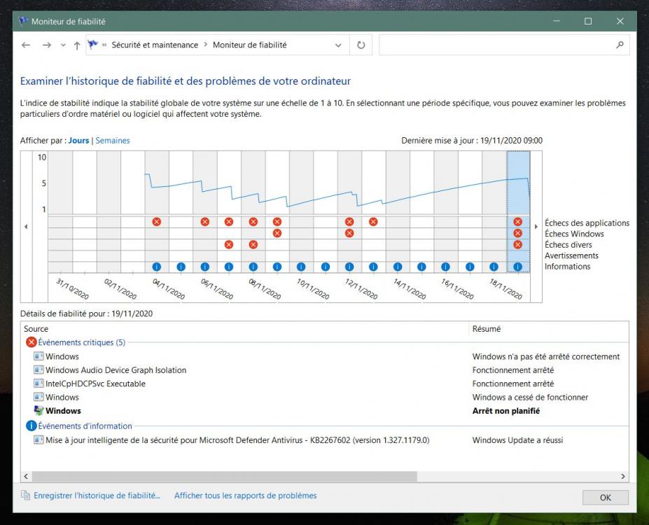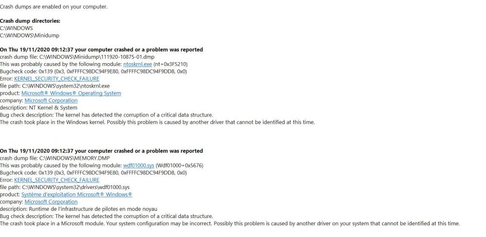 18. Bonjour, un crash qui se répète , l'ordinateur s’arrête, écran bleu apparait pas le temps de lire..les infos, l'ordinateur redémarre sans problème, inquiétant quand même... images de l'historique de fiabilité... en affichant les details : Windows: L’ordinateur a redémarré après une vérification d’erreur. La vérification d’erreur était : 0x00000139 (0x0000000000000003, 0xffffc98dc94f9e80, 0xffffc98dc94f9dd8, 0x0000000000000000). Un vidage a été enregistré dans : C:\WINDOWS\MEMORY.DMP. ID de rapport : 7bd626ee-a0c1-45b5-a14c-42f845ba518a. mes pilotes sont à jour, une solution à ce problème, merci bonne journée