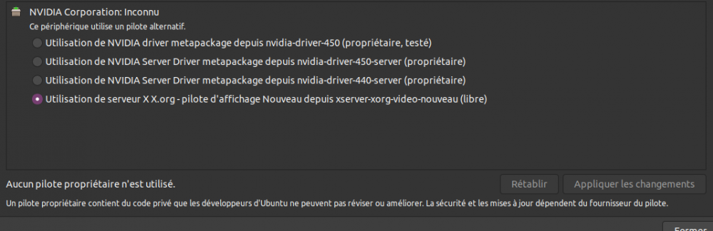 11. Hello ! On m'a fais un dualboot Windows et fedora il y a un mois, mais j'ai décidé de changer pour un dualboot Windows + Ubuntu. Hier soir donc je fais le boot avec une clé tout ce passe à peu près normalement ( sauf quelques petits problèmes de partition ). Or je ne peux pas me connecter au wifi pour une raison que j'ignore. Quand je tape "wifi" dans la barre de recherche j'ai accès au paramètres mais il me dit "Aucun adaptateur wifi trouvé". J'ai déjà essayé quelques commandes qui traînaient sur internet sans succès. Une solution ? Merci :) !