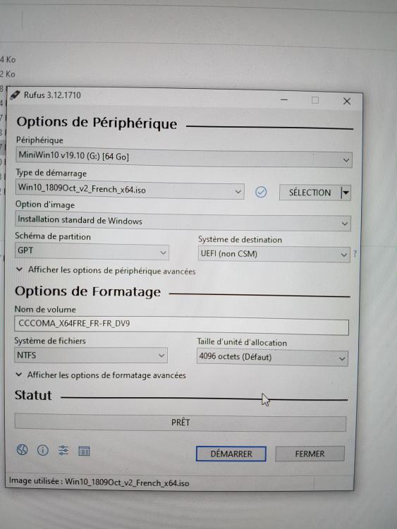 J'ai sauvé mes fichier :) Clé bootable avec w1809 créée comme montrer sur la photo. Je tente de boot avec secure boot désactivé. Fast boot désactivé. Legacy désactive. Le pc tourne en boucle sur l'écran noir.
