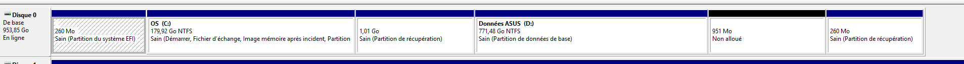 Merci pour vos réponses successives. Je vais refaire un passage de EaseUS Data Recovery Wizard Dernières aides avant le clonage du SSD. Sur le disque dur j'ai une partition de 951 Mo non alloué, dois-je l’allouer ou puis-je la rajouter à la partition D: ? J'ai une partition de 260 Mo dit de récupération ?? Quelle est son rôle ? Merci -