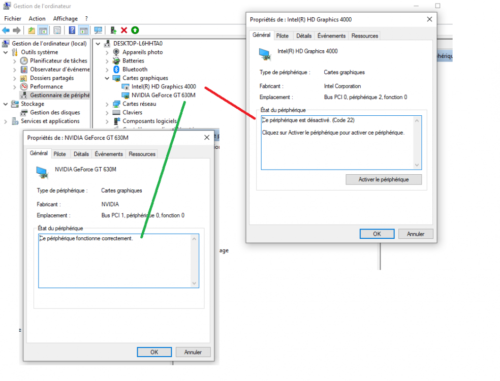 Bonjour à toutes - tous, Mon PC portable est un HP ENVY dv7-7282sf qui contient 2 cartes graphiques : INTEL(R) HD Graphics 4000 et NVIDIA GeForce GT 630M. Je précise que le driver de chaque carte est ajour. Je suppose que la qualité d'affichage sera optimale avec la Nvidia !! mais je n'arrive pas à trouver comment l'imposer ? J'ai donc décider de désactiver la carte INTEL dans le gestionnaire de périphériques, voir ci-dessous : Je ne vois pas de différence dans l'affichage ! Pire il me semble que la carte NVIDIA n'est pas active, voir ci-dessous : ----------------------------------------------------------- Comment imposer la carte NVIDIA ?? Cordialement. Le grand du 69 -