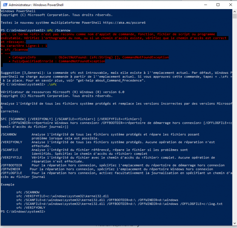 Bonjour à tous, J'utilisai régulièrement les commande Sfc ou Dism à partir du Windows PowerSchell (Admin) mais aujourd'hui j'obtiens ça : Apres recherches dans le Net ou aucune des plus folles solutions données ne fonctionne pas !! Avez-vous une solution fiable à proposer ? Cordialement. Le grand du 69 -