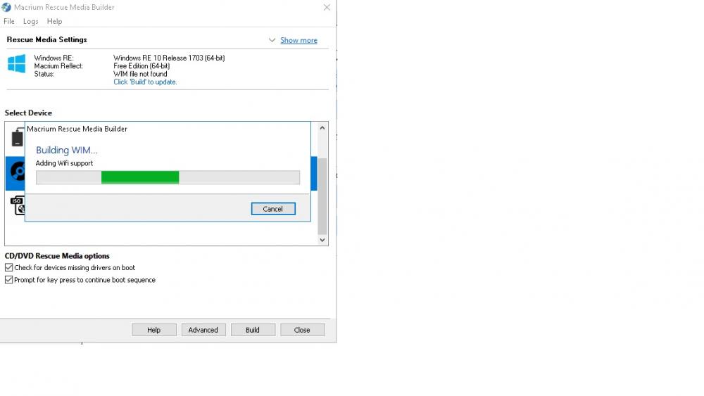 bonjour, nouveau sur votre site que j'apprécie pour la clarté des explications, j'ai suivis votre conseil, et installé macrium version home free, ça à l'air de bien fonctionner, car la création de mon image disk s'est passé comme sur des roulettes, c'est seulement à partir de la création du cd de boot que là plus rien ne se passe? <<building wmi : adding wifi support>>s'affiche et ça tourne non stop, serait ce que la capacité du cd soit trop petite?