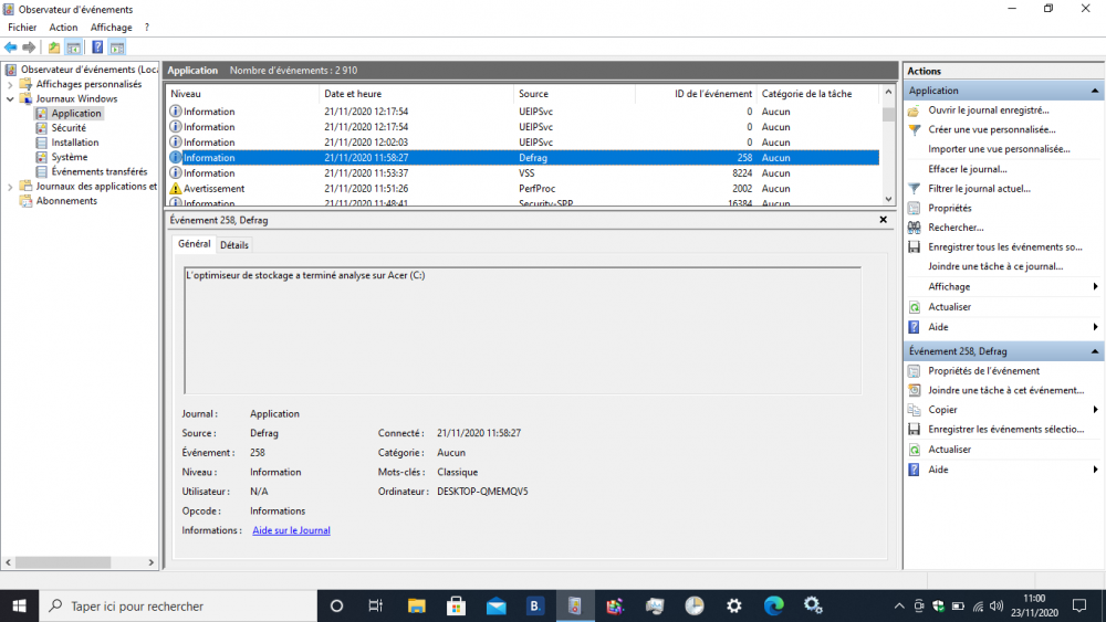 Contrôle du système du pc ACER : defrag désactivé donc OK