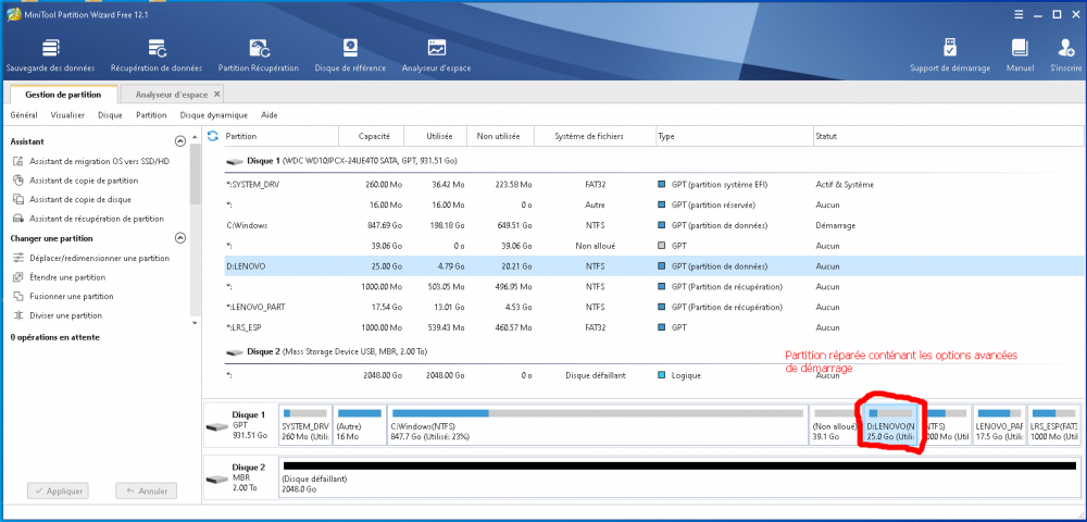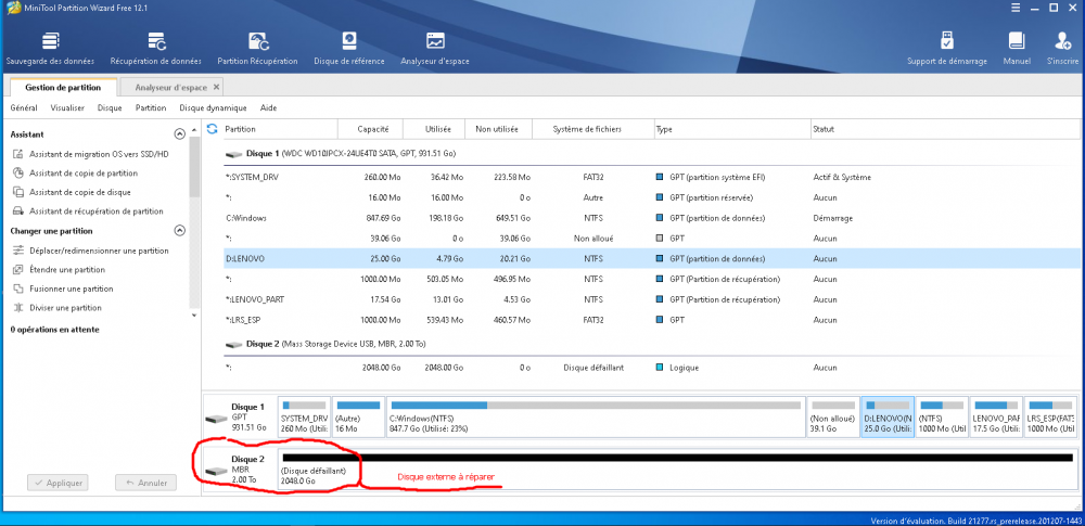 Bonsoir, Mon disque externe semble plein et défaillant. Je n'arrive-pas à le réparer avec Mini Tool Partition Wizard et testdisk. Le contenu ne m' intéresse - pas car c'est un disque que l'on m' a donné. Merci de votre aide. Bonne soirée