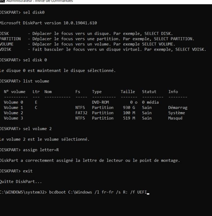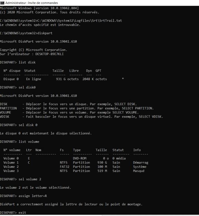 Bonjour Voici ce que j ai décidé de faire en attendant vos retours : Afin de retrouver ce que j'avais vu sans vraiment le comprendre (via testDisk) et éliminer toutes les pistes possibles ayant conduit ce Pc à des surchauffes constantes, une lenteur excessive au démarrage et des erreurs critiques de Windows.. [Par avant, j'avais lancé mes antivirus ( AdwCleaner - Zemana - malwarbyte qui sont actuellement désinstallés) puis non sans mal réinitialisé une seconde fois Windows.] A la première réinitialisation, le Pc redémarrait cependant j'observais des surchauffes et selon un possesseur, la mémoire et la consommation saturés. En créant une nouvelle partition DATA le Pc semblait plus stable, or problème persistants j'ai fait cette seconde réinitialisation. Nous avons déjà vérifié avec CrystalDiskInfo l'état du disque dur. Je crois que la partition EFI est corrompue donc : - Je tape "cmd" dans la barre de recherche + clic droit pour l exécution en tant qu'administrateur Une fois l'invite de commande ouverte je me réfère à ce que je lis ici "https://lecrabeinfo.net/erreur-srttrail-txt-lors-de-la-reparation-automatique-de-windows-10.html?highlight=Erreur%20critique%20sous%20windows". Ce n'est peut-être pas ma problématique mais je me dis que ce journal mettrait peut être en avant ce qui devait l'être (Jpeg T0001) - Puis, de nouveau barre de recherche "cmd" + clic droit pour l'exécution en tant qu'administrateur de"diskpart" en me référant à ce qui suit https://lecrabeinfo.net/reparer-demarrage-windows-10.html (T0002) *** Je n ai pas encore rentrée la dernière ligne de commande "shutdown /f /r /t 0" *** Ce que je ferai ensuite : Tester les composants testables de ce Pc Portable en suivant ces recommandations: https://lecrabeinfo.net/tester-les-composants-de-son-pc-disque-dur-memoire-vive-carte-mere-alimentation.html Nettoyer le PC en suivant ces recommandations : https://lecrabeinfo.net/pc-lent-comment-nettoyer-pc-booster.html Et, fonction des résultats trouvés et parce qu'il avait le même comportement que celui pour lequel Firebird m'a aidé, vous me direz s'il y a lieu à une désinfection.