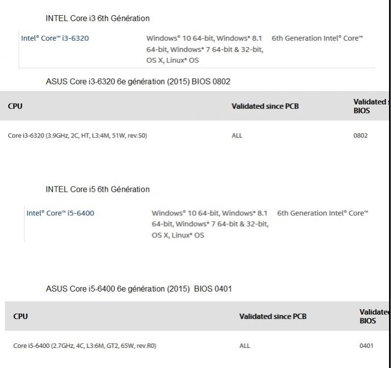 "Sur la liste des processeurs certifiés compatibles avec la carte mère, vous trouvez une version du Bios recommandée pour chaque processeur. Cependant cela ne veut pas dire que le processeur ne peut fonctionner qu'avec la version indiquée. Exemple : Core i3-6320 la version recommandé est 0802 mais la carte peut fonctionner avec toute version plus récente (1001, 1102, 1202,1302,1902....). Même explication pour la carte P10S-M WS. Mais pour connaitre sa version de Bios d'origine, il nous faut son numéro de série."