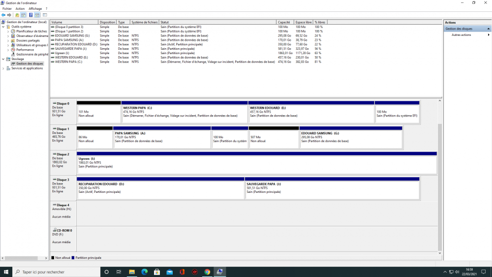 Bonjour, voici le scan de la gestion de disque, je n'ai pas pu faire le clic droit , il ne se passe rien, le disque en question est le disque 4 lecteur H: il est indiqué aucun média. Je l'ai débranché de la télévision mais pas pendant l'utilisation plutôt après.