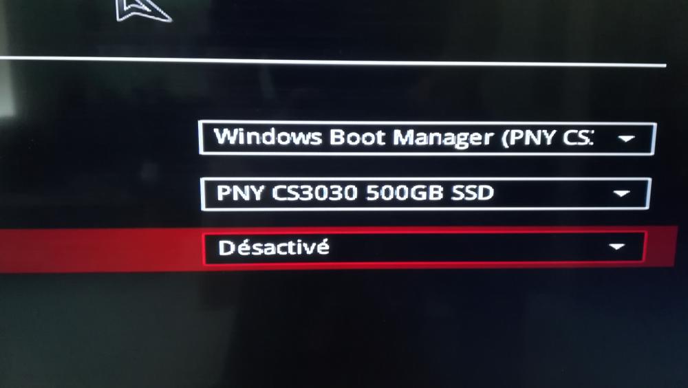 C'est quand même bizarre que le bios trouve comme option de boot "Windows Boot Manager PNY CS3030" et "PNY CS3030 500Gb SSD" Enfin, ça a l'air de démarrer à peu près bien maintenant, en 10 sec à peu près, ce qui redevient acceptable, sans être obligé par repasser par le bios une fois sur deux....... Je vais peut-être pouvoir faire l'impasse sur la ré-installation.....( Question hypocrite )..... -