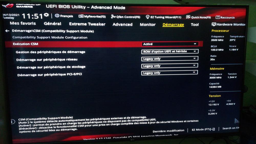 Mon bios est en uefi + legacy et mon disque système est en MBR, j'ai vérifié. Je me suis acheté la Maximus VIII Ranger bradée pour pouvoir passer en DDR4 mais je dois reconnaitre que le Bios est une véritable usine à gaz. Sur ma carte mère, il n'y a qu'un seul port M2 / Nvme. Le fait d'avoir cloné le système depuis un SSD Sata ne serait-il pas la cause de cette lenteur ? J'ai effectivement une fonction CSM activée dans le bios et il n'y a d'ailleurs que là que je trouve mention de uefi/Legacy C'est possible de faire une copie d'écran sur le bios ou il faut faire carrément une photo ? -