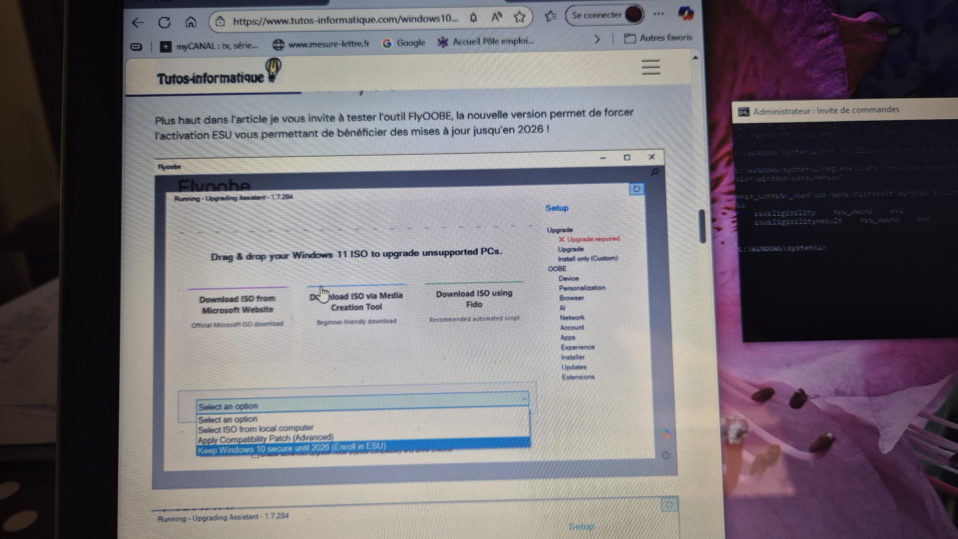 Rina91 Posté(e) le 19 septembre 2025 Auteur Posté(e) le 19 septembre 2025 Bonjour Yves. Moi je suis en France. Je viens juste d'appliquer ta 1ere partie avec l'invite de commande et j'attends le 1er redemarrage. Mon pc et mon internet sont toujours lent ici. Dis moi vite si cela pose problème pour la Region et ce que je dois faire ? Bon déjà j'ai vu au niveau de l'éligibilité que j'avais 0×0, donc inconnu/ fonctionnalite non démarré je crois???? J'ai bien suivi ta procédure qui je pense devrait remplacer le 0 par le 2. Mais tu dis que je dois changer la région ??? Pourquoi, comment je fais ça ???? Je n'aurai pas du faire la methode alors? Help! J'ai vu aussi que Flyoobee a une ligne pour débloquer l'esu? N'est-ce pas plus simple pour moi? Est6que ca ne risque pas de me mettre tout en anglais? Et en France l'Esu est deja déployé depuis un moment...donc J Merci encore Pour ton aide