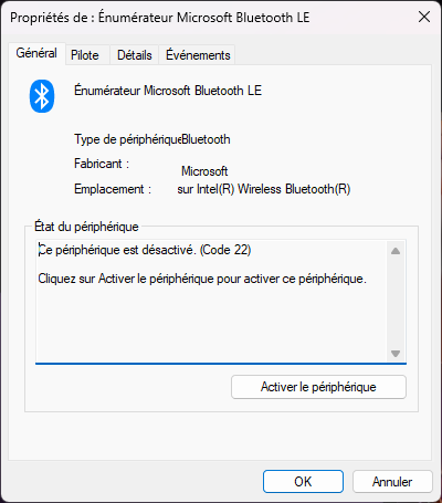 Papizac Posté(e) il y a 1 heure Posté(e) il y a 1 heure Bonjour , j'ai des aides auditives que je voudrais connecter a mon PC . J'ai une carte mère Gigabyte B550 pro Gaming qui n'a pas de Bluetooth LE pour pouvoir y connecter mes aides. j'ai donc acheter une carte : Carte WiFi 5400Mbps PCIe WiFi 6E Bluetooth5.3, Intel WiFi 6E AX210, Tri-Bandes (6GHz/5GHz/2.4GHz) Carte WiFi 6 pour PC Win 11/10(64Bit mais Windows n'a pas envie que je l'utilise !!! Après installation, voila ce que ça donne dans le gestionnaire de périphériques; quand je regarde Enumerateur Microsoft Bluetooth LE, ce sont les pilotes Microsoft et non Intel qui sont installés Insert Résultat impossible de connecter mes aides, et impossible d'installer les pilotes Intel que j'ai récupéré sur le site Intel. Par contre quand je clique sur Intel wireless Bluetooth J'ai bien les pilotes Bluetooth mais pas LE Je n'y comprends plus rien. Merci d'avance de votre aideInsert