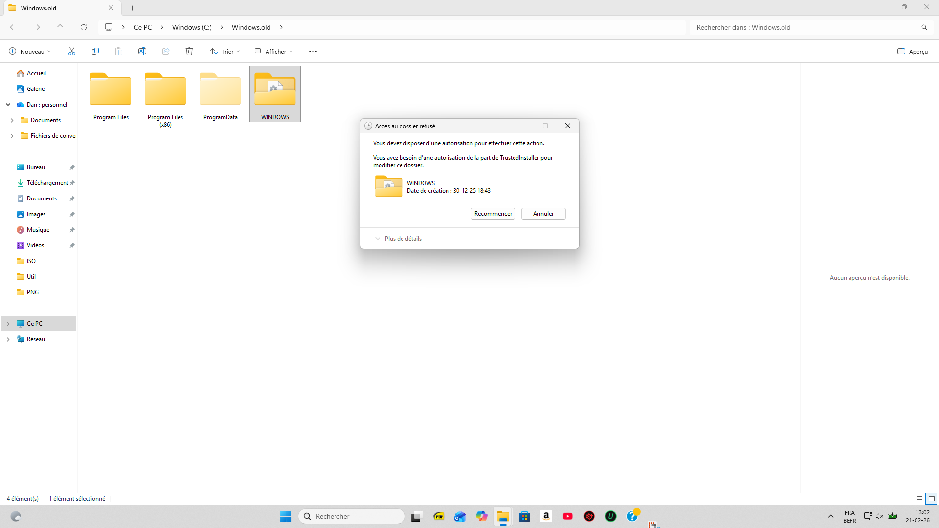 MaxlaMenace Posté(e) il y a 1 heure Posté(e) il y a 1 heure Bonjour, En dépit des indications fournies sur le site du crabe info, je n'arrive pas à désinstaller Windows.old qui est bien présent sur le pc mais ne s'affiche pas dans Système, Stockage, Fichiers temporaires.Ce dossier est par contre bien affiché sur C: et affiche 28,3 go.Pour l'ouvrir, j'ai besoin d'une autorisation de Trustedinstaller. Merci de m'indiquer le moyen de supprimer ce dossier