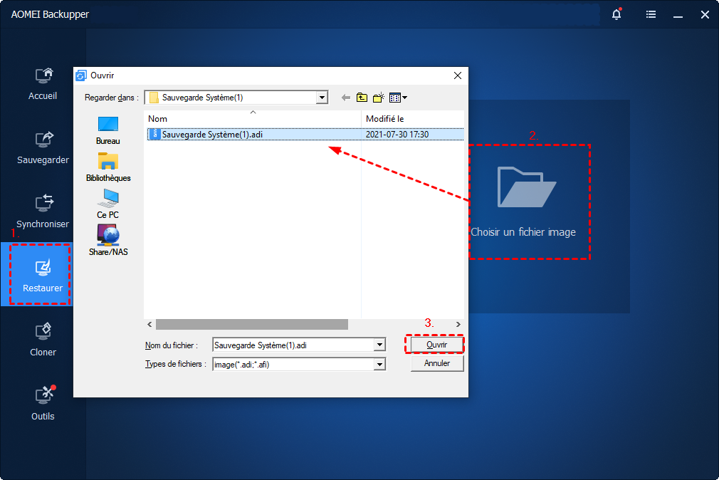 Le PoissonClown Posté(e) le 11 mars Posté(e) le 11 mars Bonjour Jérome, Je pense qu'il y a confusion entre : Image du disque dur : l'image de votre disque dur capturée avec AOMEI Backupper (Sauvegarder - Sauvegarde système) (et qui n'est pas du tout compatible avec Rufus). Image disque amorçable : l'image disque (historiquement CD-ROM/DVD) amorçable / bootable / de démarrage (Outils - Créer un média de démarrage) (qui est souvent au format .iso et compatible avec Rufus). AOMEI Backupper capture votre image disque dans un fichier .adi, ce fichier contient une copie de vos données, et n'est pas l'image d'un système amorçable que l'on peut utiliser via Rufus. Sauvegardez cette image disque .adi dans un disque dur externe. Et lorsque vous en aurez besoin, vous démarrez votre ordinateur depuis votre clé USB de démarrage contenant AOMEI, vous allez dans l'option "Restaurer" et vous branchez le disque dur externe contenant votre sauvegarde pour pouvoir la sélectionner. Est-ce que c'est plus clair ainsi ?
