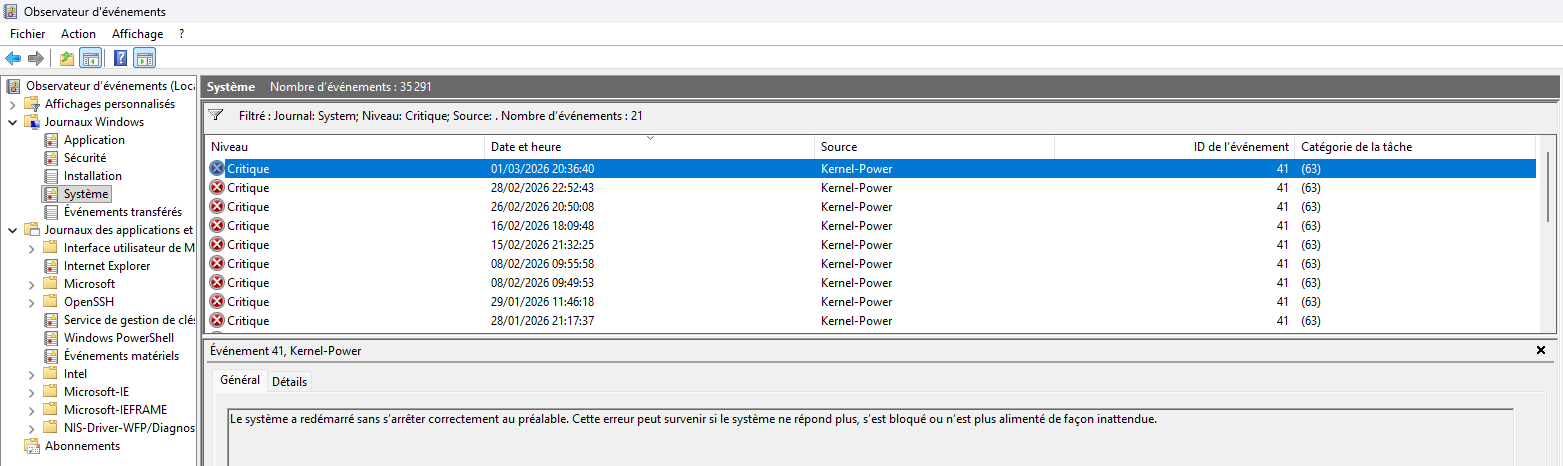 KcsGreg Posté(e) il y a 1 heure Posté(e) il y a 1 heure Bonsoir, Je suis récemment entrain de regarder une émission d'info et tout d'un coup mon écran ce bloque et je l'ai redémarré et ça me le refais plus mais ça me l'a encore fais aujourd'hui Je sais pas comment réglé ce problème Hormis ce petit blocage Le laptop est en très bonne santé Voici un userdiag : https://userdiag.com/id/IQXSlMsju9 Dans l'observateur d'evenement j'ai sa Mais quand ça me bloque ça me fais pas d'écran bleu ou noir Et je suis obligé de l'arrêter avec le bouton power